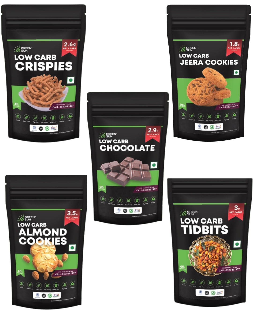 - AN ARRAY OF FLAVORS: Green Sun Low Carb products come with an Array of Flavors indulged in the Hamper with Spicy, Tasty & Relishing Snacking options with Low Carb Crispies, Tid-Bits with Delightful scrumptious baked delights with Jeera Cookies & Almond Cookies & to fulfill your Sweet tooth Cravings with our Low Carb Chocolate with Zero Sugar to keep your diet regimen Delectable.